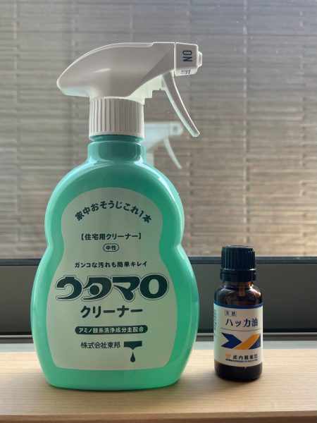今回はハッカ油を床の雑巾がけの際に使用してみました。バケツに水を溜め、ハッカ油を3滴ほど垂らす。これだけでも十分虫よけ効果、殺菌・除菌効果もありますが、今回はウタマロクリーナーも追加して同じバケツに5プッシュしてみました。