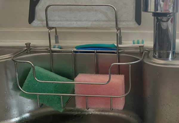 スポンジの置き場は今までシンクに最初から付属していたかご(?)を使用して置いていました。このかご、濡れたままにしていると錆が付いてしまったり、かごの付いている裏部分のシンクが洗いづらく、水垢がよくついていました💦