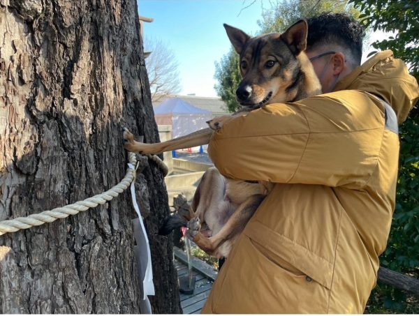 奥へ進むと大きな銀杏のご神木があり、愛犬も一緒にご神木に触れる事が出来ました。